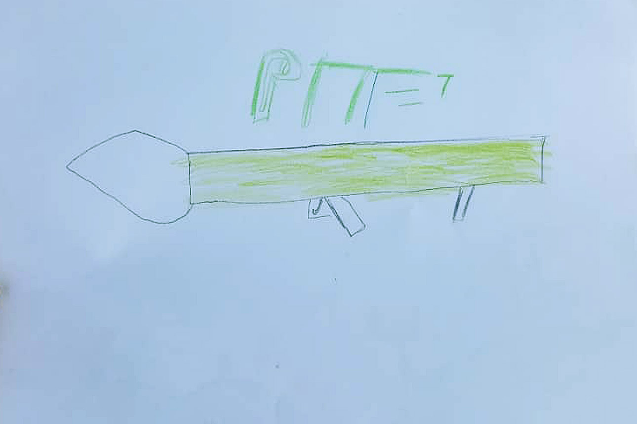 На рисунке 11-летнего Андрея из Майорска - немного неуклюжий РПГ. Когда война только началась, он переехал за Бахмут, к бабушке. Там пошел в первый класс. Но уже ко второму вернулся в Майорск. И до осени 2018-го с еще двумя друзьями каждый день ходил в школу в Горловку, в ДНР. Сейчас снова перебрался под Бахмут.