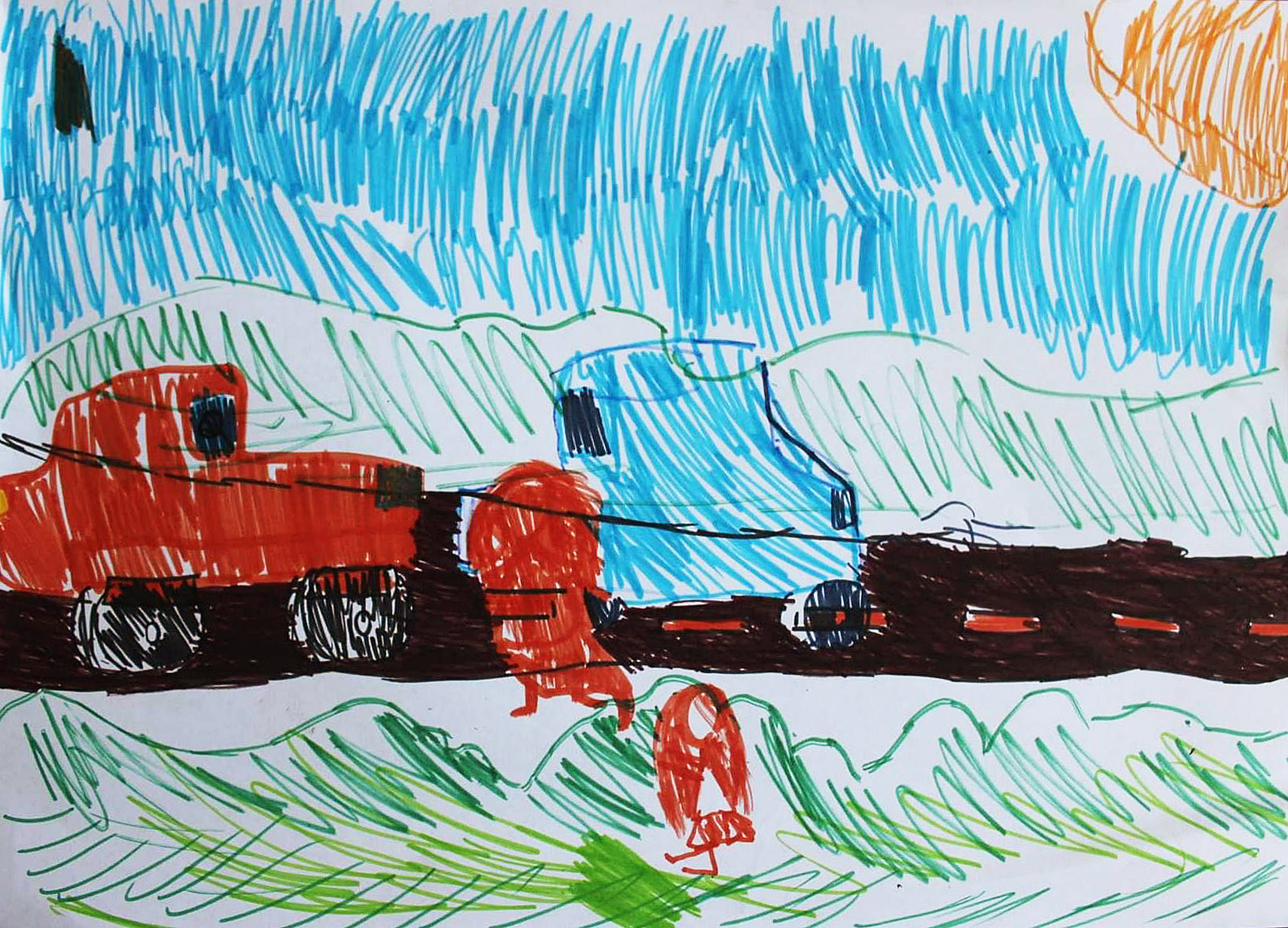 Танк и колонна военных машин с человеком на переднем плане, направившим автомат на бегущую девочку, - это рисунки двух сестер-близняшек, Оли и Полины. Им по десять с половиной лет. Они были под обстрелами в Славянске, Семеновке, Лимане, Донецке в 2014 году. Одна из девочек онемела, когда семья выезжала из Славянска в Лиман через Семеновку. Девочек с мамой и старшим братом остановили на блокпосту, всех из автобуса вывели, военный угрожал, что начнет стрелять, если кто-то сдвинется с места. Маме было трудно уследить за двумя пятилетними девочками, одна из сестричек испугалась и начала убегать. Военный взял ее на прицел, поднеся автомат прямо к лицу. Ее рисунок - танк, которых она видела немало. Семья все время пыталась уехать от войны, которая их как будто догоняла, и это всегда сопровождалось громкими звуками и тяжелой техникой.