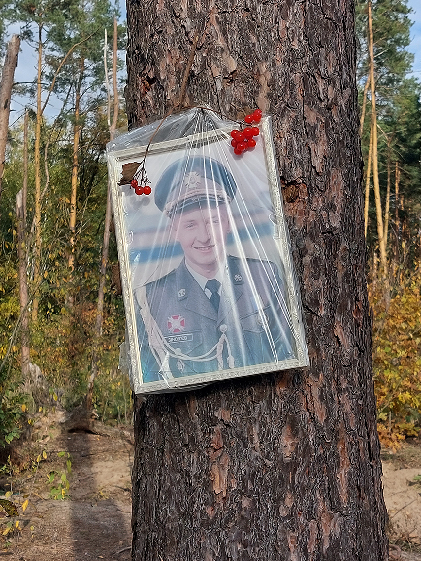 В самом лесу, возле окопа, где нашли тело Бадри, стоит памятная плита в его честь. В нескольких десятках метров от нее прямо на дереве прикреплено фото другого военного по фамилии Зиновьев. Везде флаги, цветы, свечи...