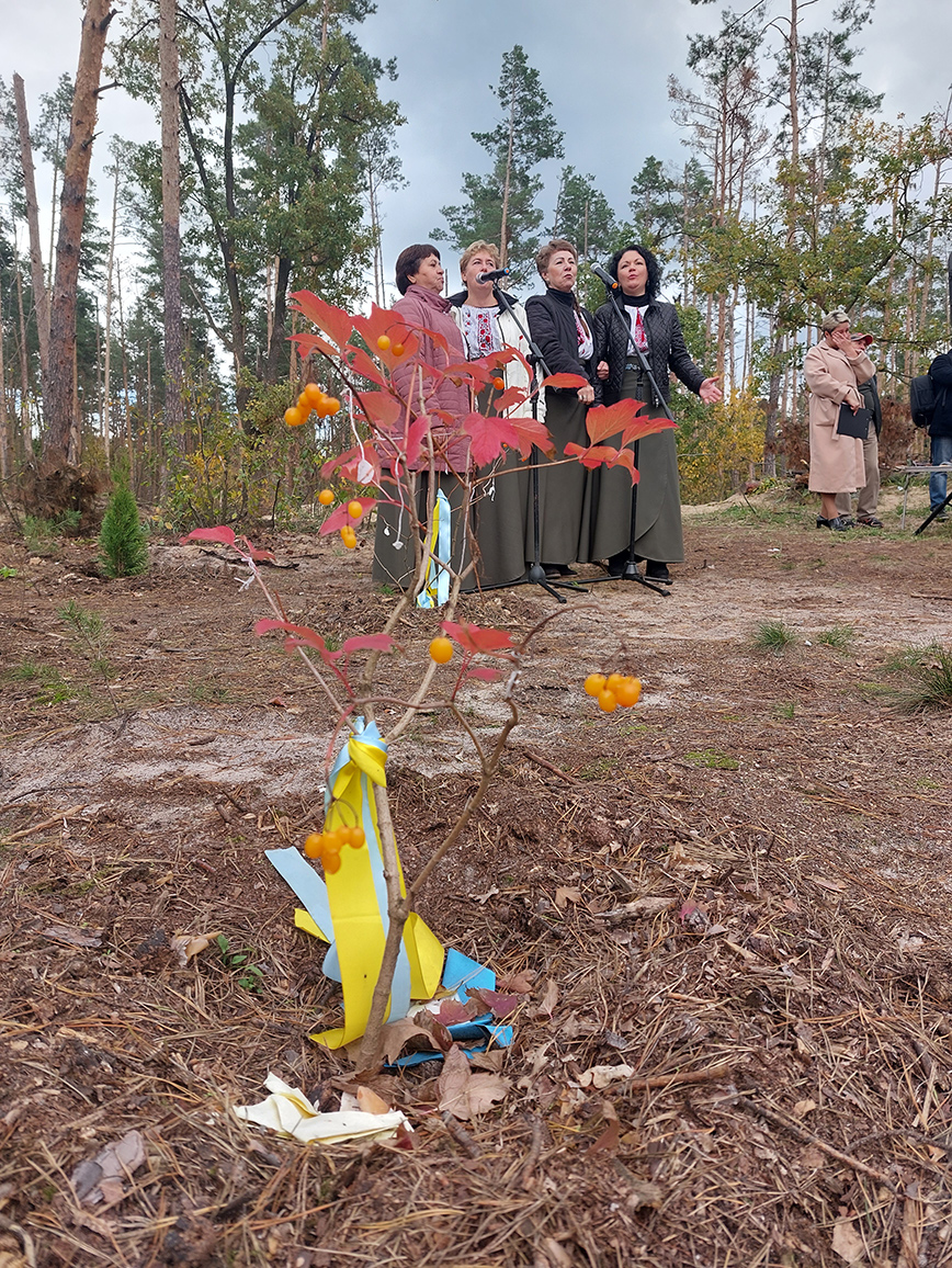 14 октября, в День защитников и защитниц Украины, здесь собралось несколько десятков людей, чтобы воздать почести своим героям, помолиться и основать Аллею в их честь. Мужчины и женщины высадили кусты калины, туи, хризантемы и другие растения.