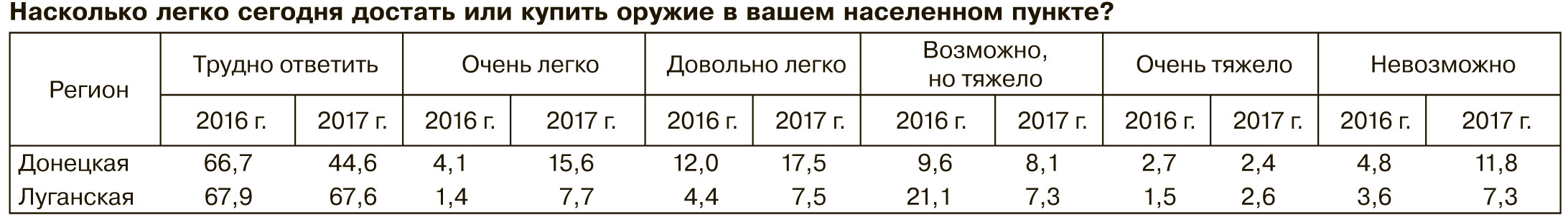 Но социальная ситуация в регионе напряженная. Самой важной проблемой остается нехватка рабочих мест. Особенно остра она для жителей Луганской области. В Донецкой ее острота за год несколько уменьшилась. Обе области страдают от роста алкоголизма и наркомании. Конечно, это вызывает опасение стать жертвой преступления. Люди открыто говорят, что не могут чувствовать себя в безопасности в регионе, где почти у каждого ПТСР, где много безработных мужчин, доступны алкоголь и наркотики и, что самое опасное, - доступно оружие. Данные исследования показывают, что по сравнению с 2016 годом оружие в регионе стало еще более доступным. В Донецкой области тех, кто ответил, что "достать или купить оружие легко" или "очень легко", больше на 17%, в Луганской - на 9,4. Причем к традиционным мотивам иметь оружие "для защиты имущества" или "своей семьи" добавляются "для возможной продажи" (Луганская область) и "для возможного участия в боевых действиях", "совершения преступлений", "ради любопытства и желания пострелять" (Донецкая область). Этот "коктейль" пугает многих и угрожает не только жителям зоны АТО, но и стране в целом.