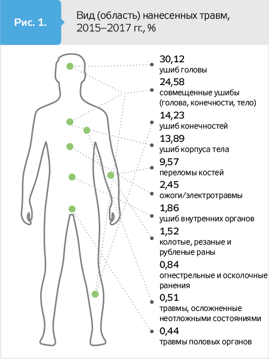 Только по официальным данным учреждений здравоохранения, 2386 человек в 2017 г. обратились за медпомощью из-за травм, причиненных работниками полиции. И с каждым годом таких обращений становится больше. Медики фиксируют травмы головы (30,12% из всех видов травм), корпуса тела, конечностей, множественные травмы.