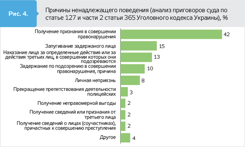 На втором месте среди наиболее распространенных причин истязаний и жестокого обращения - "наказание лица за определенные действия или за действия третьих лиц, в совершении которых их подозревают" и запугивание задержанного лица.