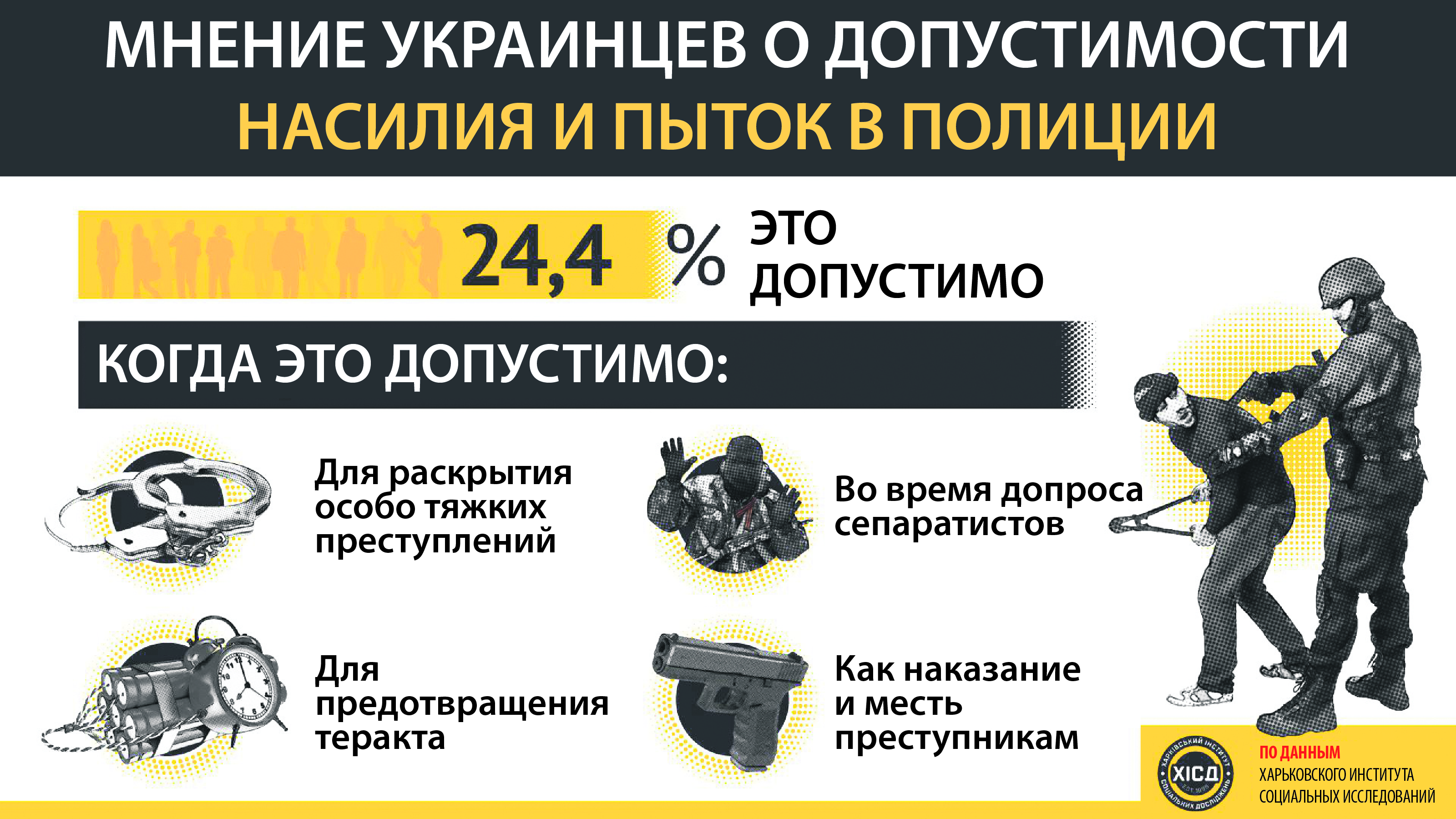 Опасной тенденцией является то, что продолжает возрастать количество украинцев, допускающих применение насилия в работе полиции. Почти каждый четвертый украинец (24,4%) так или иначе допускает возможность применения полицией незаконного насилия, или даже истязаний. Наиболее допустимым незаконное насилие остается "для раскрытия особо тяжких преступлений", "для предотвращения террористического акта" и "как наказание и месть насильникам, убийцам". Это довольно печальные данные, демонстрирующие, что в обществе постепенно нарастает усталость от неопределенности и опасений, возрастает желание поступиться своими правами ради безопасности. Но все же большинство украинцев понимает, что такой обмен никогда не приведет к подлинной безопасности. Это доказывает и наш национальный опыт.