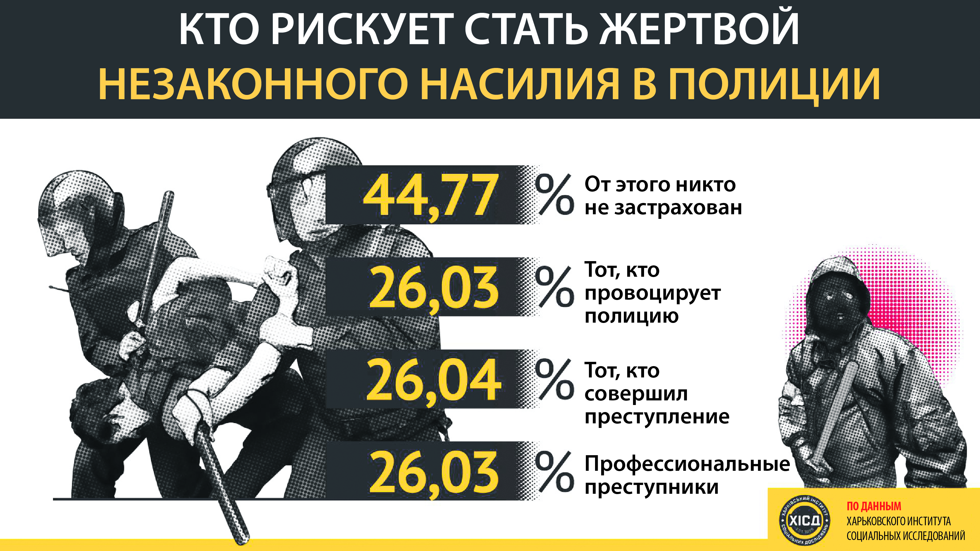 Вместе с тем мнение украинцев о том, кто именно больше других рискует стать жертвой насилия в полиции, практически не изменилось. Как и 13 лет назад, больше всего опрошенных все еще придерживаются мнения, что от насилия в полиции не застрахован никто (44,77%). К группе риска прежде всего относят "тех, кто провоцирует полицию" (26,03), "профессиональных преступников" (26,03) или "совершивших любое преступление" (26,04%).