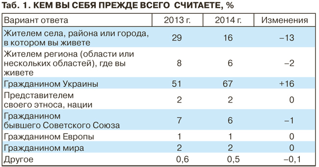 Так, оказалось, что для украинцев уже менее важно быть жителем села, района, области, т.е. "локальным" гражданином. На вопрос "Кем вы считаете себя в первую очередь?" респонденты на 16% чаще отвечали: прежде всего - гражданами Украины. В 2013-м таких ответов было 51% (это простое большинство), а сегодня - 67% (больше двух третей, т.е. уже конституционное большинство). Это большой прорыв в сознании украинцев. Я бы сказал, самый существенный, тектонический сдвиг в сознании.