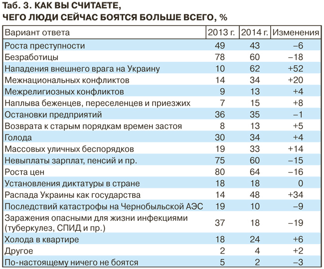 На четвертом месте среди страхов, ставших актуальными для украинцев в т.г., - страх массовых уличных беспорядков. В 2013-м такую опасность отмечали 19% граждан, сейчас - 33%. И это не случайно. Уже есть ростки расползания терроризма по всей Украине (см.таб.3).