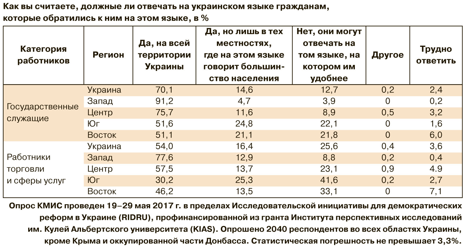 Еще более показательны ответы на четкие вопросы о том, "должны ли отвечать на украинском языке гражданам, которые обратились к ним на этом языке", государственные служащие и "работники торговли и сферы услуг" (участков, ныне преимущественно частных). Что касается госслужащих, то в 2017 г. 70% (на 9% больше, чем в 2014-м) ответили: "Да, на всей территории Украины", а еще 15 - "Да, но лишь в тех местностях, где на этом языке говорит большинство". Только 13% поддержали мнение, что чиновники "могут отвечать на языке, на котором им удобнее" (см. таблицу). Даже в восточных и южных регионах более половины респондентов признали общенациональную обязанность чиновников отвечать на государственном языке и менее четверти согласились, что те могут выбирать язык общения с гражданами по своему усмотрению. Мало того, за последние три года радикально выросла поддержка позиции, что уважать языковой выбор граждан должны также предоставляющие услуги. Аж 54% (против 35 в 2014-м) сказали, что те должны отвечать на украинском по всей Украине, и лишь 26% - что так, как удобнее. На востоке и юге страны за обязательность украинского высказались более трети респондентов, что несколько меньше, чем сторонников традиционного "удобства", но вместе с тем вдвое больше, чем было три года назад.