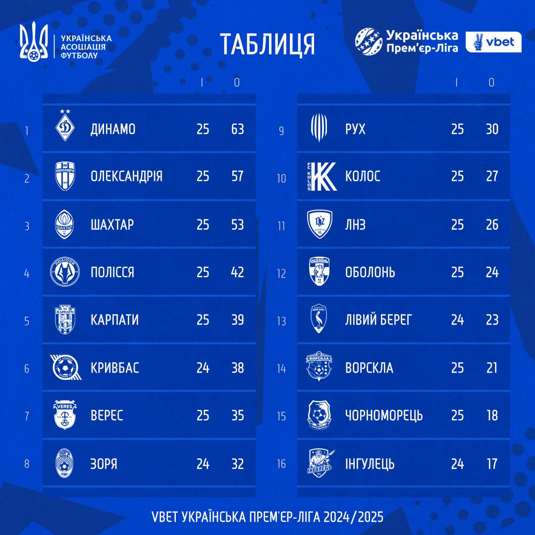 С 18 по 20 апреля прошли матчи 25-го тура украинской Премьер-лиги по футболу сезона-2024/25.