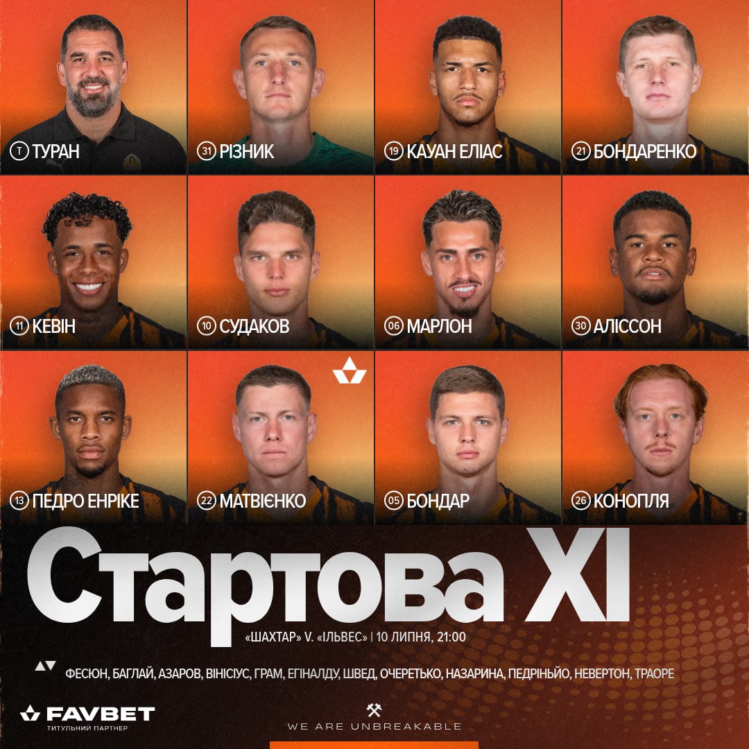 "Шахтер": Ризнык, Элиас, Бондаренко, Судаков, Кевин, Марлон, Алиссон, Матвиенко, Бондарь, Педро Энрике, Конопля.