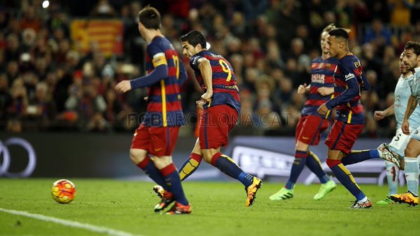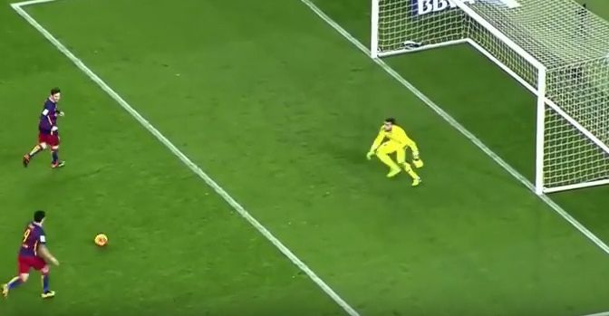 К мячу подошел Лео Месси, но не стал пробивать, а отдал пас вправо на Луиса Суареса, который и отправил мяч в сетку ворот. Гол был забит по всем правилам: пас был сделан вперед, все полевые игроки, кроме Месси, в момент удара находились за пределами штрафной, Месси не касался мяча второй раз до касания другого игрока, и мяч сделал минимум один полный оборот.
