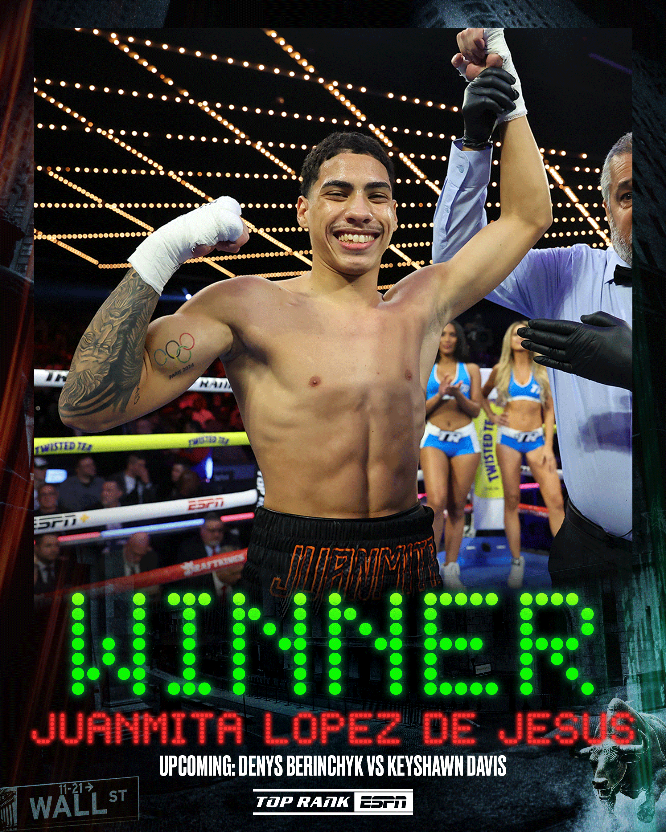 3:30. В одном из боев сын знаменитого пуэрто-риканского экс-чемпиона мира Хуанмы Лопеса, Хуанма Лопес де Хесус, дебютировал на профессиональном ринге и нокаутировал своего соперника Брайана Сантьяго уже в первом раунде.