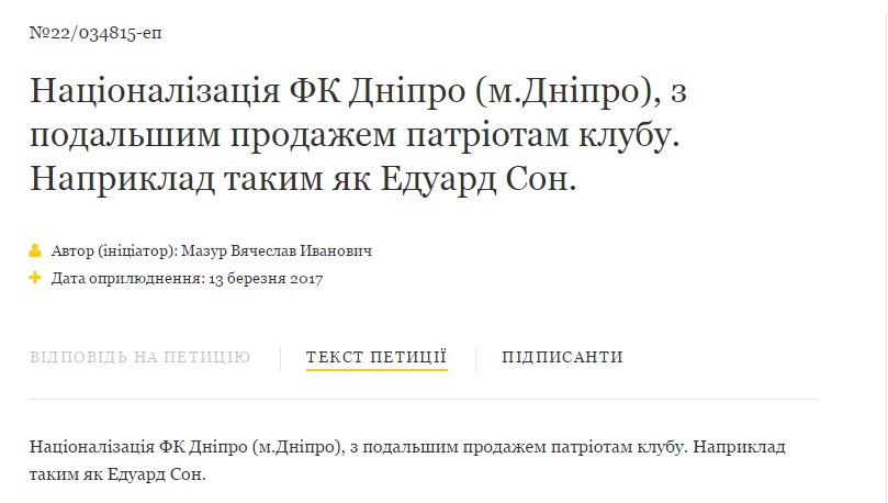 На странице официального интернет-представительства президента Украины появилась петиция с просьбой о национализации "Днепра" для его дальнейшей продажи.
