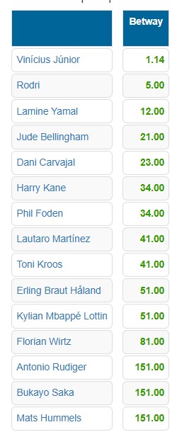 В первую тройку фаворитов также вошли испанского чемпионы минувшего Евро-2024 Родри из "Манчестер Сити" (5,00) и вингер "Барселоны" Ламин Ямаль (12,00).