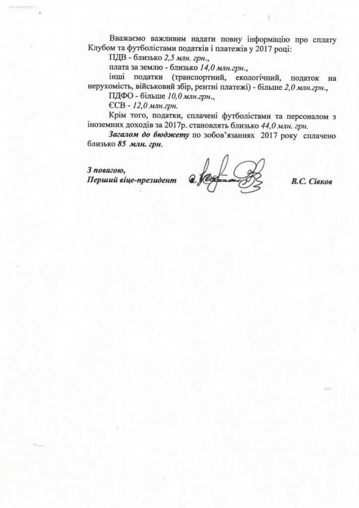 "Вниманию СМИ, которые регулярно касаются темы обязательных платежей "Динамо" в бюджет. Ниже размещаем скан-копии документов, свидетельствующих о том, что клуб является добросовестным налогоплательщиком и не имеет в этом никаких претензий со стороны Государственной фискальной службы Украины (ГФСУ). Просим журналистов использовать в своих публикациях достоверную информацию со ссылкой на компетентные органы", – сказано в обращении "Динамо".