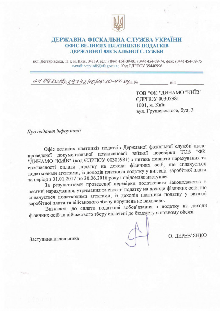 Офис крупных плательщиков налогов Государственной фискальной службы не нашел никаких нарушений в заявленных "Динамо" зарплатах и уплаченных военных сборах.