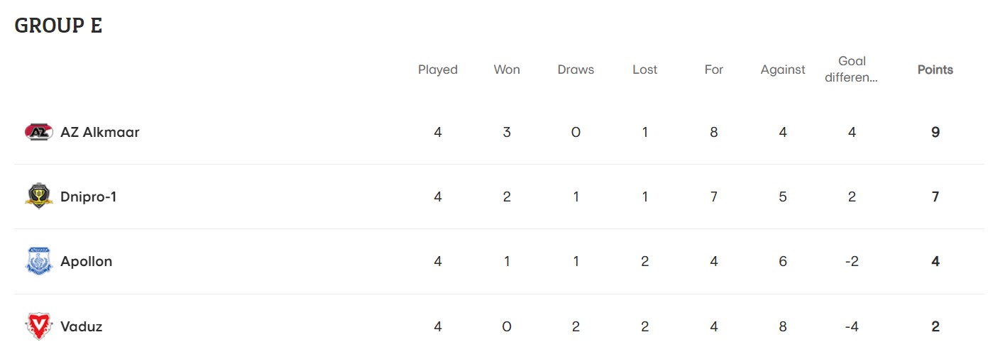 По итогам четырех туров "Днепр-1" набрал семь очков и занимает второе место в группе E. Следующий матч подопечные Александра Кучера проведут против кипрского "Аполлона" на своем поле 27 октября.