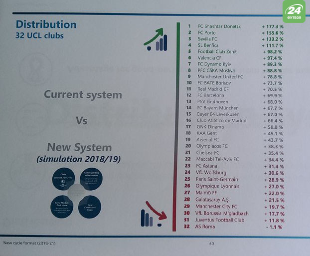 Для прогнозирования УЕФА взял результаты клубов в Лиге чемпионов по итогам сезона 2015/16. По расчетам УЕФА, клуб, который может получить самые ощутимые финансовые результаты в процентном соотношении - донецкий "Шахтер". "Горняки" могут увеличить поступления от ЛЧ на 177,3%. Киевское "Динамо" - в топ-10 клубов данного рейтинга, на 7-м месте. Рост доходов киевлян может составить 89,3%.