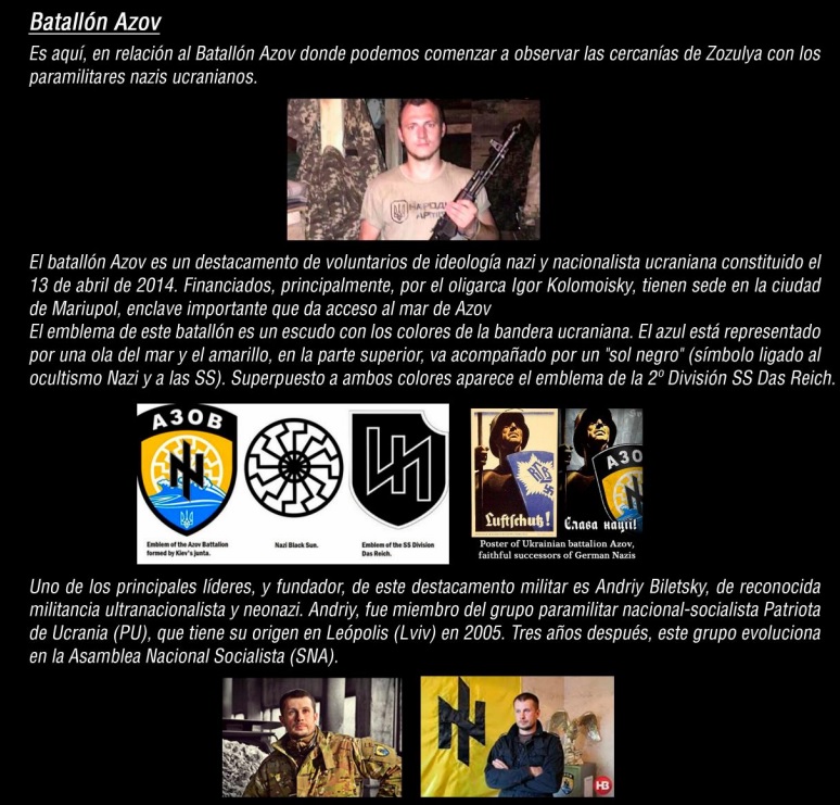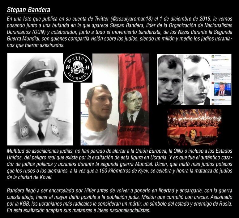 В документе указывается на связь Зозули с батальоном "Азов", который сравнивается с нацистами. Кроме того, на одном из фото Роман держит оружие, испанские фанаты также отмечают сравнения Зозули со Степаном Бандерой.