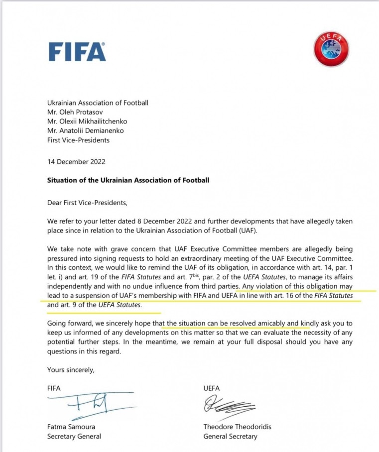 "ФИФА и УЕФА в адресном письме вице-президентам УАФ напоминает, что украинская ассоциация должна осуществлять управление своими делами без влияния третьих сторон. Любое нарушение этого обязательства может привести к приостановлению членства УАФ в ФИФА и УЕФА в соответствии со ст. 16 Устава ФИФА и ст. 9 Устава УЕФА", – написала Витак.