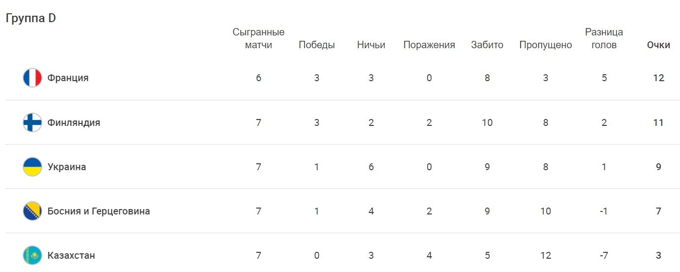 Таким образом, Финляндия набрала 11 очков и теперь занимает второе место в группе, обойдя Украину (9). На первом месте французы, которые в случае успеха в сегодняшнем поединке против Казахстана гарантируют себе прямую путевку на мундиаль.