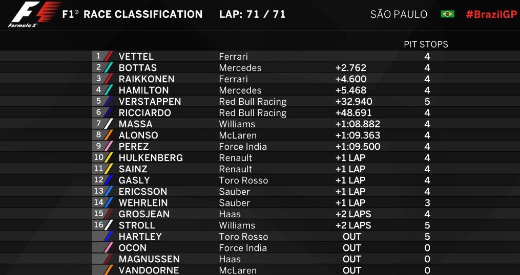 Победу на автодроме "Интерлагос" одержал гонщик "Феррари" Себастьян Феттель, а в топ-3 вошли Валттери Боттас из "Мерседеса" и еще один представитель "Феррари" Кими Райкконен.