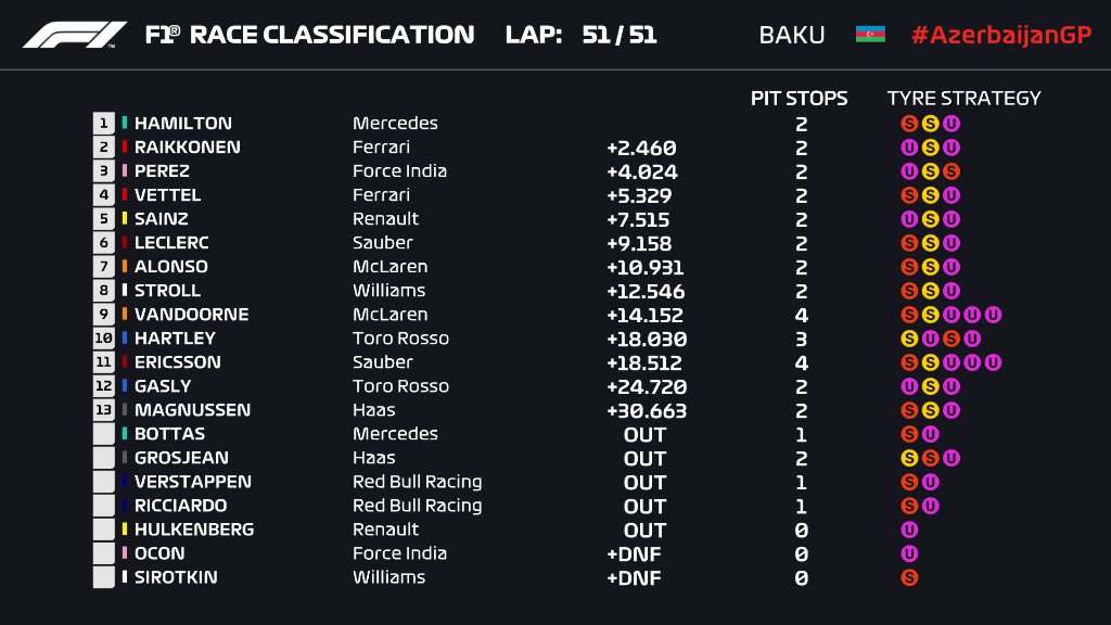 Райкконен, всю гонку проведя за спинами "Ред Булл" и "Мерседеса", ухитрился финишировать вторым, а Перес, несмотря на 10-секундный штраф, вошел в историю Гран-при Азербайджана, как единственный пилот, дважды поднимавшийся на подиум. Победа в Баку стала первой для Хэмилтона в текущем сезоне.