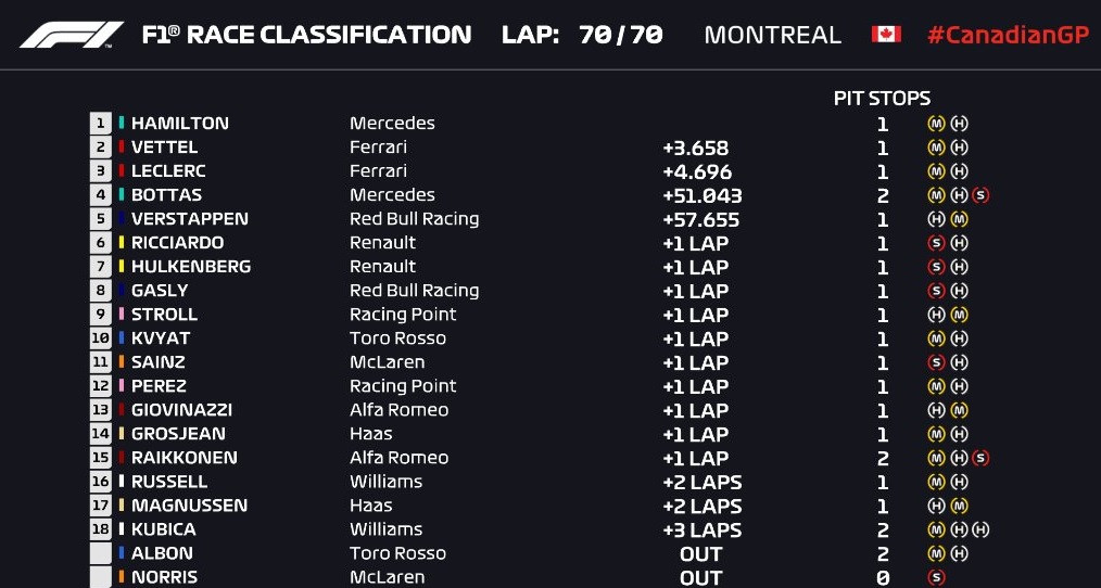 Пилот "Мерседеса" Льюис Хэмилтон выиграл Гран-при Канады, несмотря на то, что в самой гонке первым финишировал гонщик "Феррари" Себастьян Феттель.