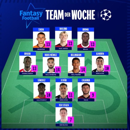 Команда недели Лиги чемпионов: Марк-Андре тер Стеген ("Барселона"), Давиде Калабрия ("Милан"), Фабиан Шер ("Ньюкасл"), Давинсон Санчес ("Галатасарай"), Осман Букари ("Црвена Звезда"), Мигель Альмирон ("Ньюкасл"), Джуд Беллингем ("Реал"), Браис Мендес ("Реал Сосьедад"), Брума ("Брага"), Расмус Хейлунн ("Манчестер Юнайтед"), Даниил Сикан ("Шахтер").