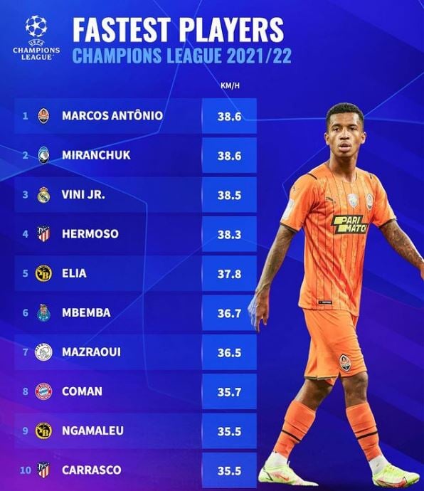 Топ-3 замкнул Винисиус Жуниор из "Реала" – 38,5 км/час, на четвертом месте Эрмосо из "Атлетико" (38,3), а пятое место занимает Элиа из "Янг Бойз" (37, 8).