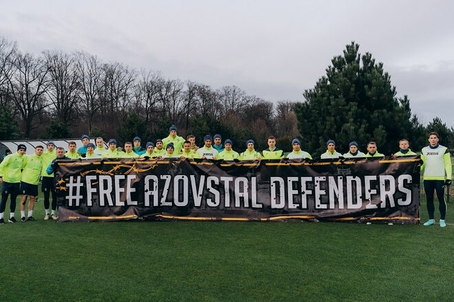 Вчера, 24 марта, после заключительной тренировки в Опаленице футболисты сборной Украины развернули баннер Free Azovstal Defenders.
