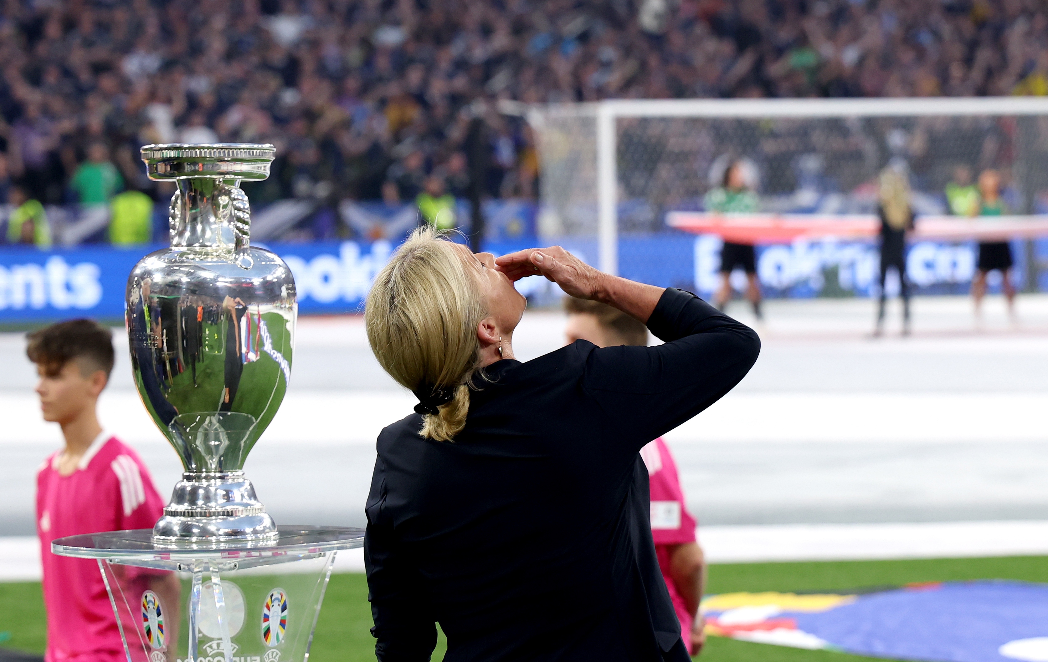 Хайди Беккенбауэр, вдова покойной легенды футбола Франца Беккенбауэра, вынесла трофей чемпионата Европы, Кубок Анри Делоне, на поле.