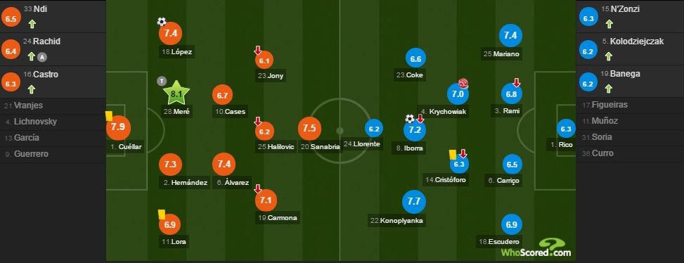 Украинец провел на поле весь матч и получил за игру оценку 7,7. За 90 минут на поле Коноплянка нанес 5 ударов по воротам (из них 2 в створ), отдал 4 обостряющие передачи и совершил 66 касаний мяча. Отметим, что выше украинца оценку получили только вратарь "Спортинга" Иван Куэльяр (7,9) и защитник "Спортинга" Хорхе Мере (8,1).