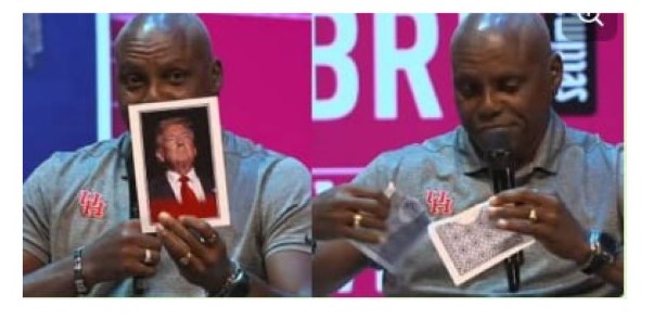 Легенду мирового спорта попросили прокомментировать фотографии известных американских людей, а когда ему в руки попался снимок Дональда Трампа, он пририсовал ему рога, разорвал фото на части и разбросал по сцене.