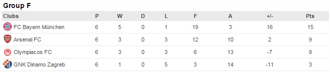 "Бавария" подтвердила статус лучшей команды квартета F, забив два мяча загребскому "Динамо", а лондонский "Арсенал" разгромил "Олимпиакос" и подвинул греков со второй позиции.