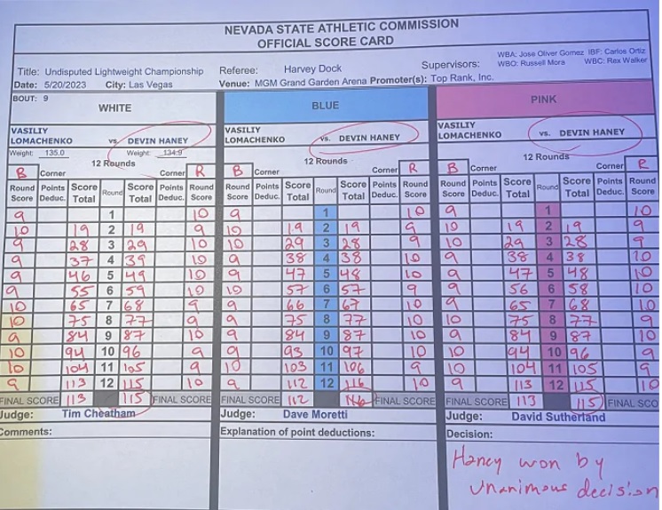 Согласно официальным судейским запискам, бесспорное преимущество, когда хотя бы два из трех судей отдавали ему победу, было у украинца в пяти раундах: на старте боя и в его концовке.