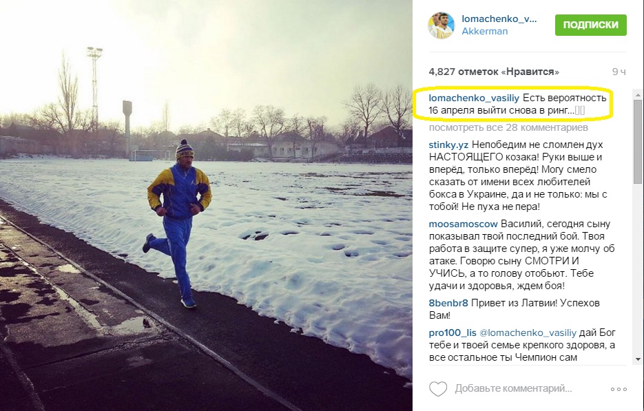 Украинский чемпион мира по версии WBO Василий Ломаченко на своей официальной странице в Instagram поделился фотографией с пробежки, которую подписал следующим образом: "Есть вероятность 16 апреля выйти снова в ринг".