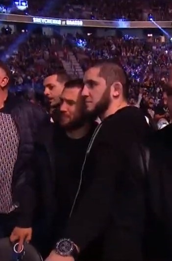 На трибунах боксер встретился и сделал совместное фото с российским чемпионом UFC в легком весе Исламом Махачевым. Их объятия попали в кадр на заднем плане в одном из видео, опубликованных в соцсетях UFC.