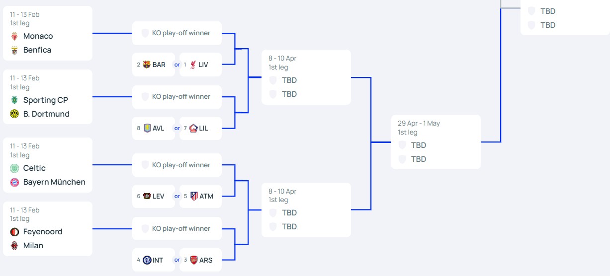 Первые матчи пройдут 11-13 февраля, а ответные – 18-19 февраля. Победители выйдут в 1/8 финала, куда уже прошли восемь команд, которые заняли 1-8 места в единой лиге.