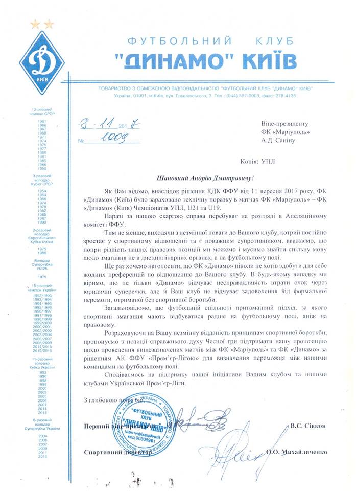 Напомним, в сентябре КДК ФФУ засчитал "Динамо" техническое поражение 0:3 за неявку без уважительных причин на матч в Мариуполе, который должен был состояться 27 августа, а сегодня, 9 ноября, стало известно, что киевский клуб изъявил желание на переигровку встречи.