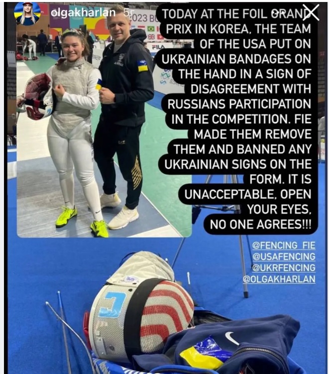 "Сегодня в Корее на Гран-при по фехтованию на рапирах сборная США надела повязки в цветах флага Украины на руку как знак несогласия с участием россиян в соревнованиях. FIE заставило их снять повязки и запретило любые украинские символы на форме. Это неприемлемо, откройте глаза. Никто не согласен", – написала Харлан в сторис Instagram.