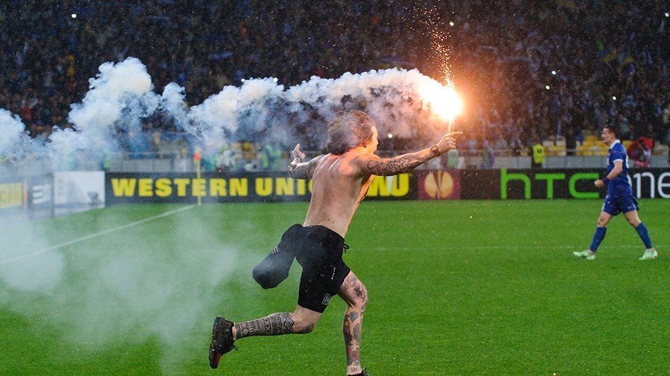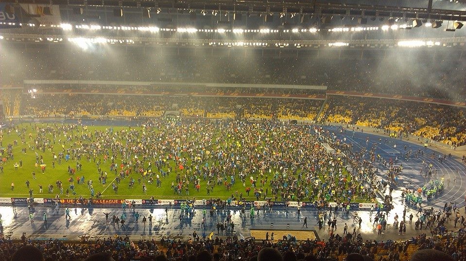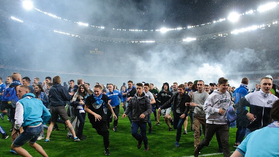 После того, как судья матча серб Милорад Мажич дал финальный свисток, зафиксировав историческую победу днепрян, болельщики огромной толпой ринулись на поле НСК "Олимпийский" в Киеве. На трибунах собралось более 60 тысяч зрителей, но часть из них не сдержала эмоций.