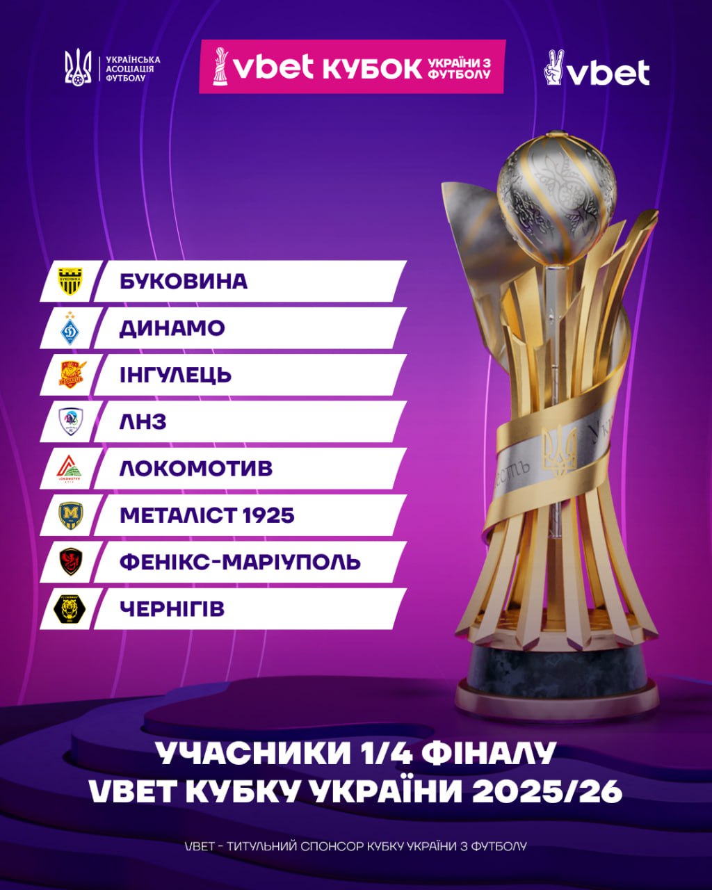 Все участники 1/4 финала Кубка Украины: "Феникс-Мариуполь", "Металлист 1925", ФК "Чернигов", "Буковина", "Ингулец", "Локомотив" (Киев), ЛНЗ и "Динамо".
