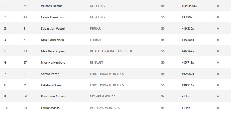 Победу в ОАЭ праздновал пилот "Мерседеса" Валттери Боттас, который при этом не сумел сместить Себастьяна Феттеля из "Феррари" со второго места в итоговом зачете сезона.