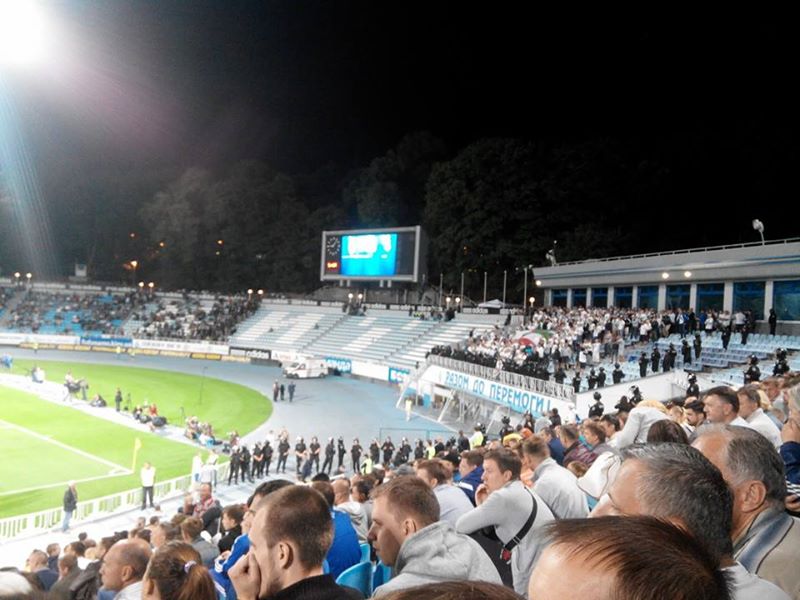Представители правопорядка оградили болельщиков живой стеной, чтобы избежать потасовок с местными ультрас. Кроме того, поляки выкрикивали оскорбительные речевки в адрес Степана Бандеры и Украины.
