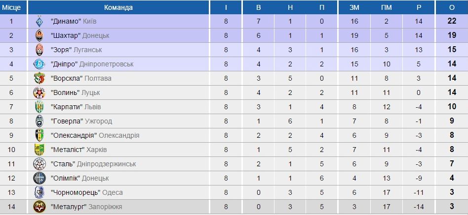 По итогам восьмого тура украинской Премьер-лиги "Динамо" сохранило лидерство в чемпионате, а "Заря" вышла на третье место.