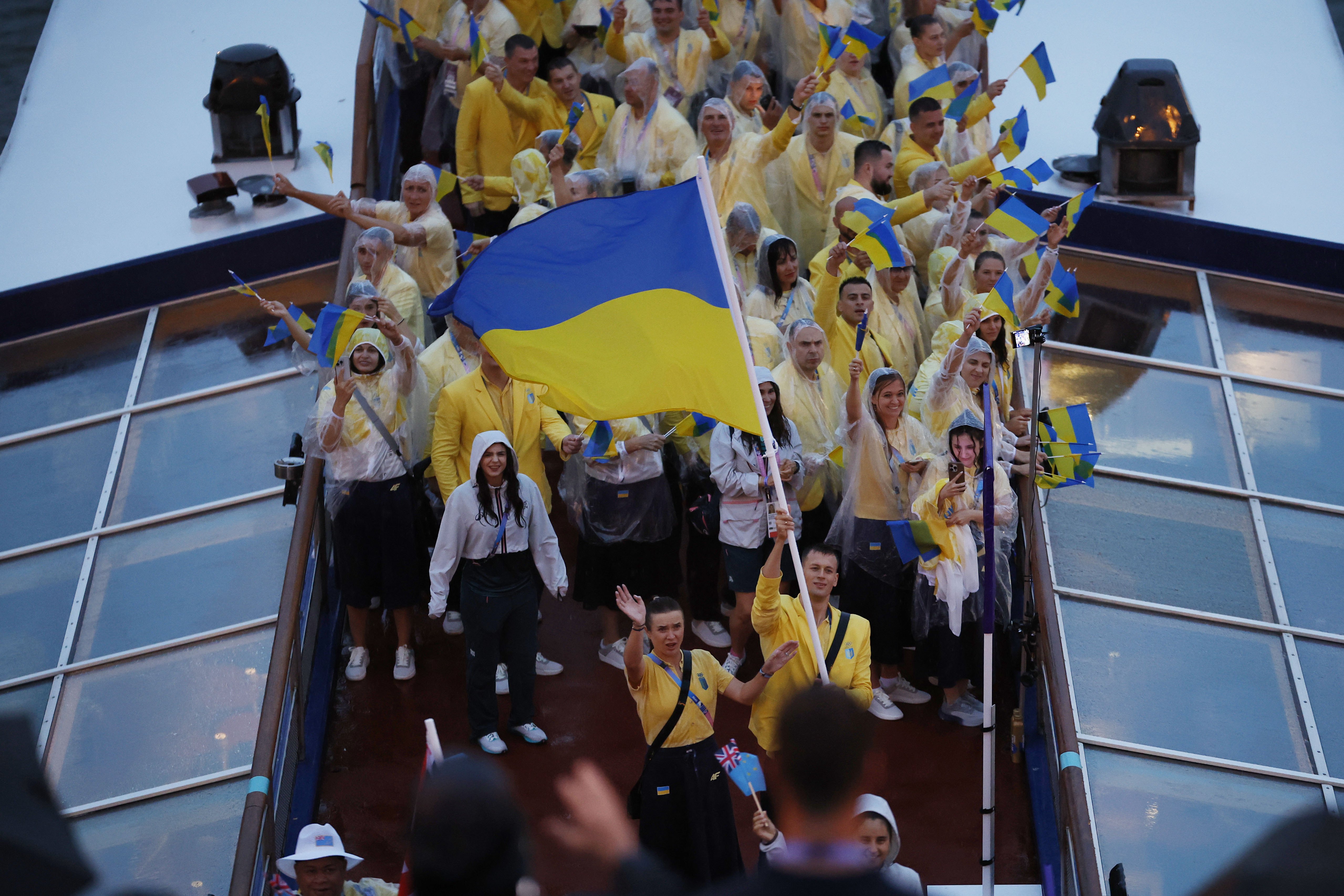 Украинская сборная под дождем проплыла на церемонии открытия под 193-м номером. Украинцы проплыли на одном корабле с Туркменистаном, Тувалу и Уругваем.