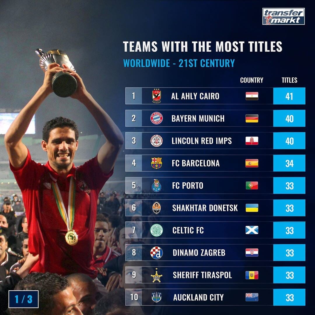 "Горняки" с 33 титулами занимают 6-ю строчку, а киевляне расположились на 14-м месте, имея в активе 25 трофеев. Среди лидеров "Аль-Ахли" Каир, "Бавария" и "Линкольн" Гибралтар.