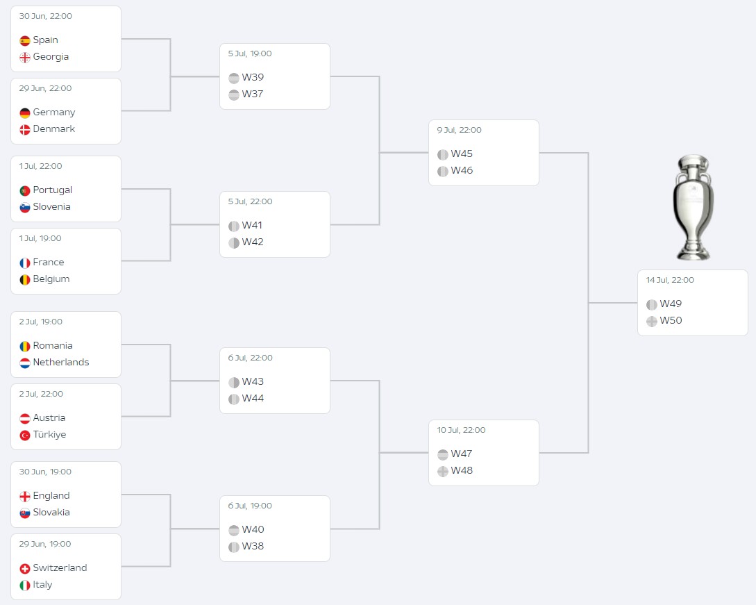 Вся сетка плей-офф Евро-2024 выглядит следующим образом: