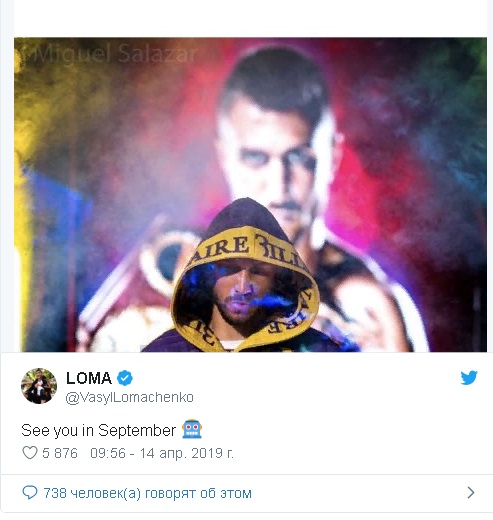 Обладатель титулов чемпиона мира WBA и WBO в легком весе Василий Ломаченко (13-1, 10 КО) собирается выйти на ринг в следующий раз в сентябре 2019 года.